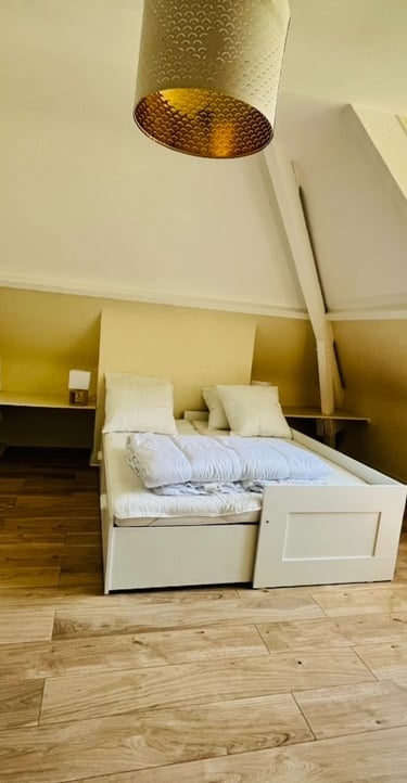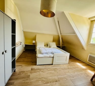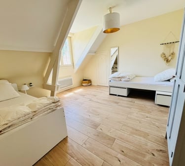 - Chambre 4 comprend deux lits en 80 avec barrière pour les enfants, pouvant être accolés pour un lit en 160 sans barrières.