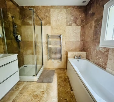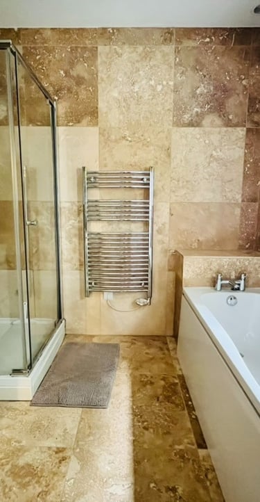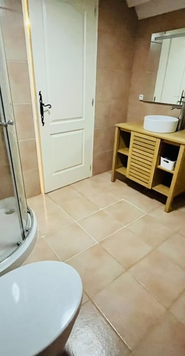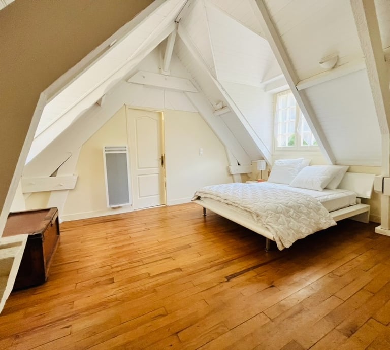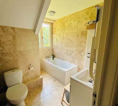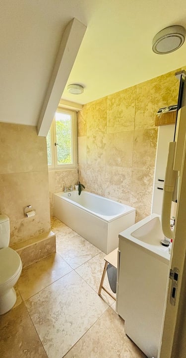 S’ajoute à cela une salle de bain à l’étage avec douche, baignoire et WC.